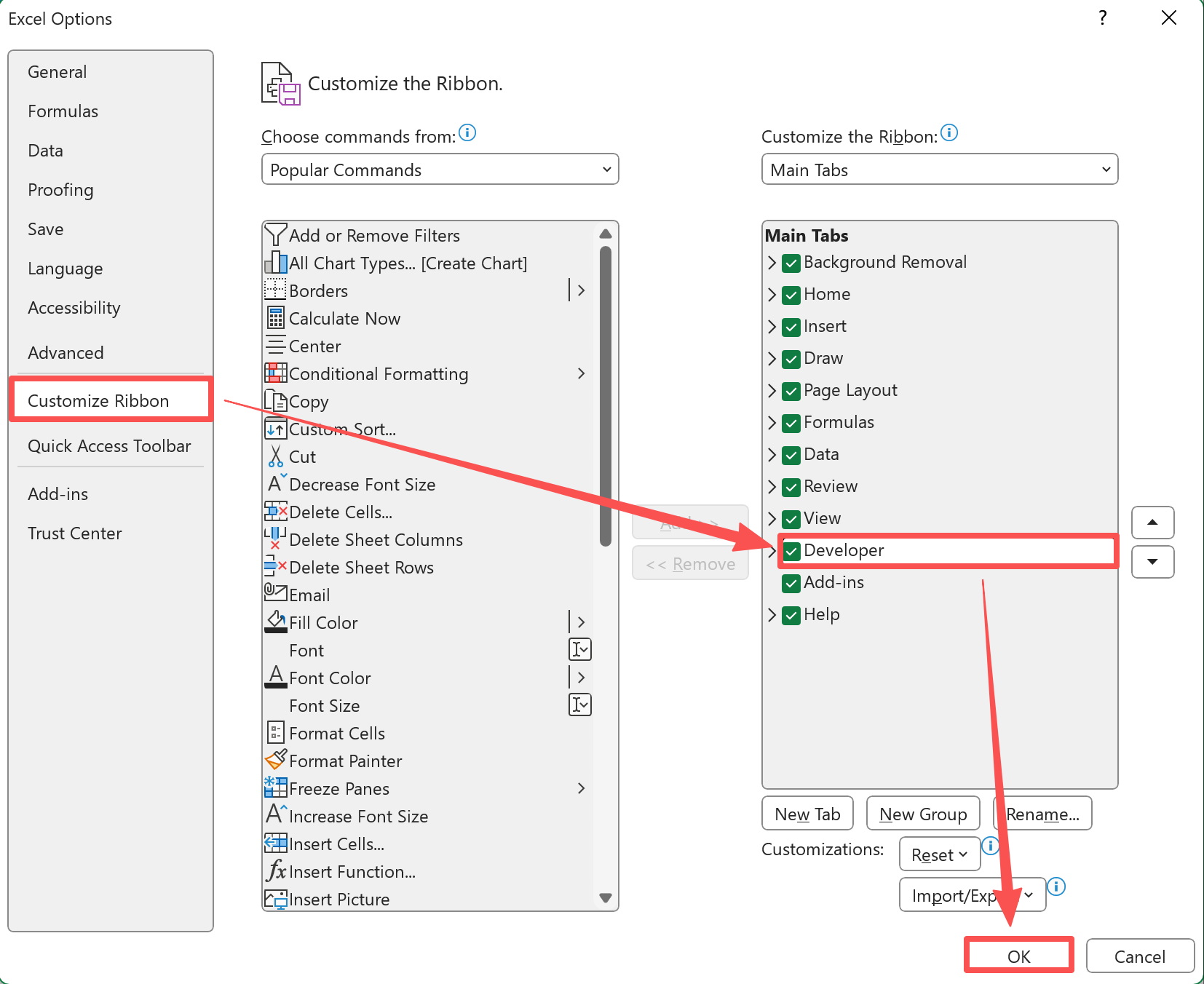 Pick Customize Ribbon from the left side. On the right, under Main Tabs, check Developer.