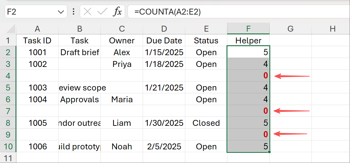 In the Tasks sheet, delete rows where all cells in columns B to E are blank.