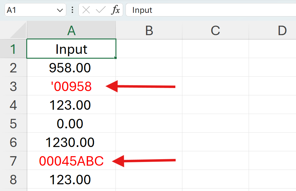| 000123 | Numeric-looking text with multiple leading zeros |