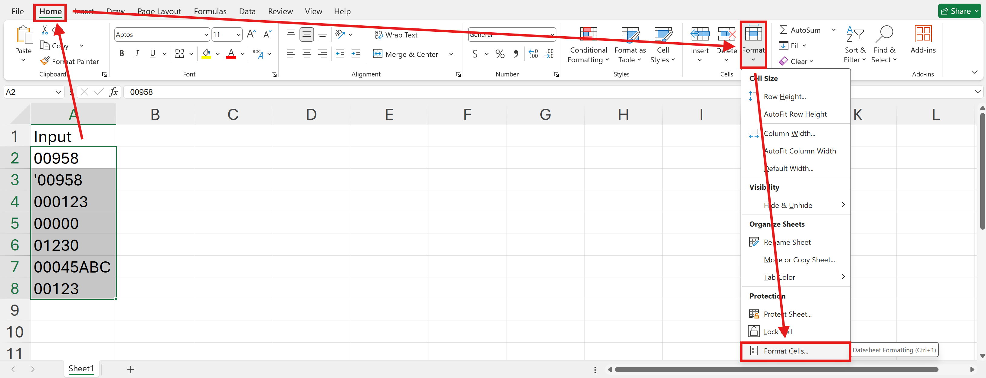 Press Ctrl+1 to open Format Cells or click Home, Format, Format Cells.