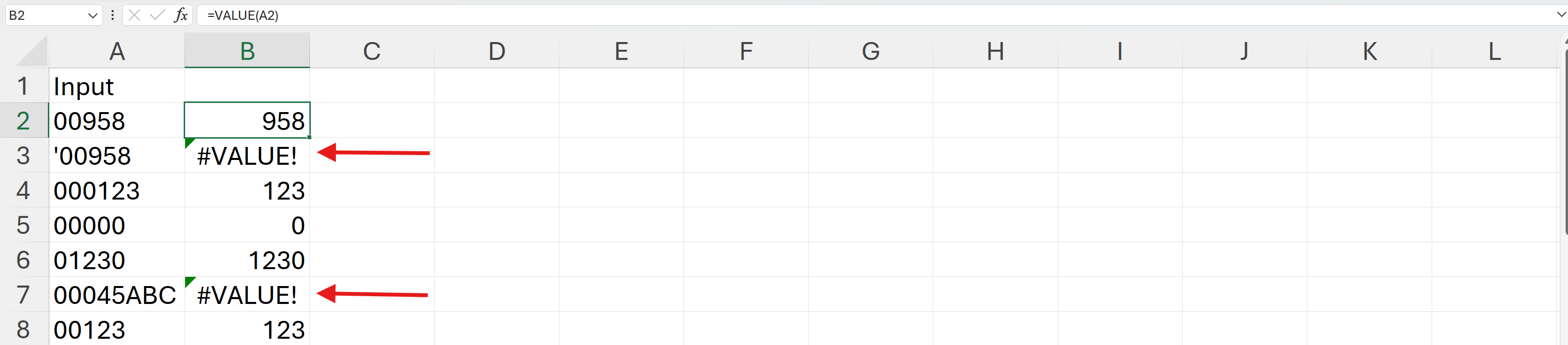 When cells include letters, VALUE will error. If you need to strip only the leading zeros while leaving the rest untouched, use a simple peel-off formula across columns.