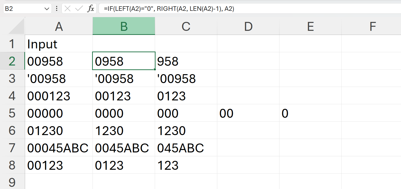 Now select column B, copy it to column C with the same formula, and repeat once or twice more until the values stop changing. For example, 00045ABC becomes 45ABC. Internal zeros remain unaffected.